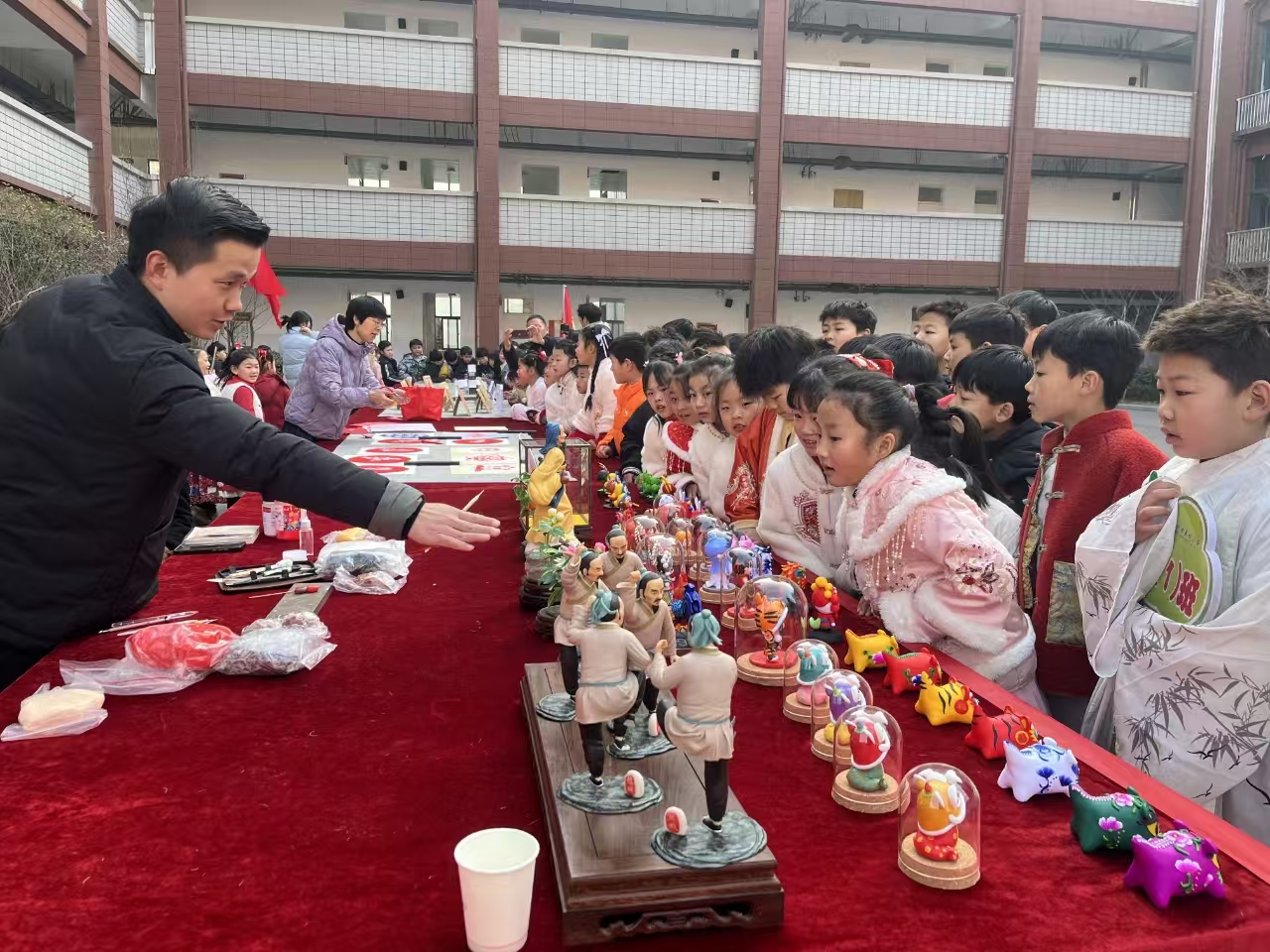 本次进校园活动围绕非遗展示展演布置了晰扬掌、亳州古琴演奏技艺、传统乐器箫非遗展演区和亳州剪纸、亳州面塑非遗展示区,晰扬掌老师在现场教授学生晰扬掌的招牌动作,引得孩子们争相模仿;古琴老师和现场合奏古琴名曲,在悠扬悦耳的乐声中,孩子们近距离感受古琴艺术和箫的魅力;剪纸老师展示别出心裁的剪纸作品,手中的剪刀翻飞,演示剪纸技巧和纹样的花样剪法;琳琅满目的面塑吸引孩子们的目光,一块面团在面塑老师的手中完成惊人的蜕变。一系列的非遗展示和教学受到孩子们的追捧,更加深了学生们对亳州非遗的了解,并并在孩子们心中种下一颗非遗文化的种子,这颗种子会慢慢萌芽成长,孩子们最终会从中体会到这片土地上诞生的非遗文化中蕴含的厚重情感。