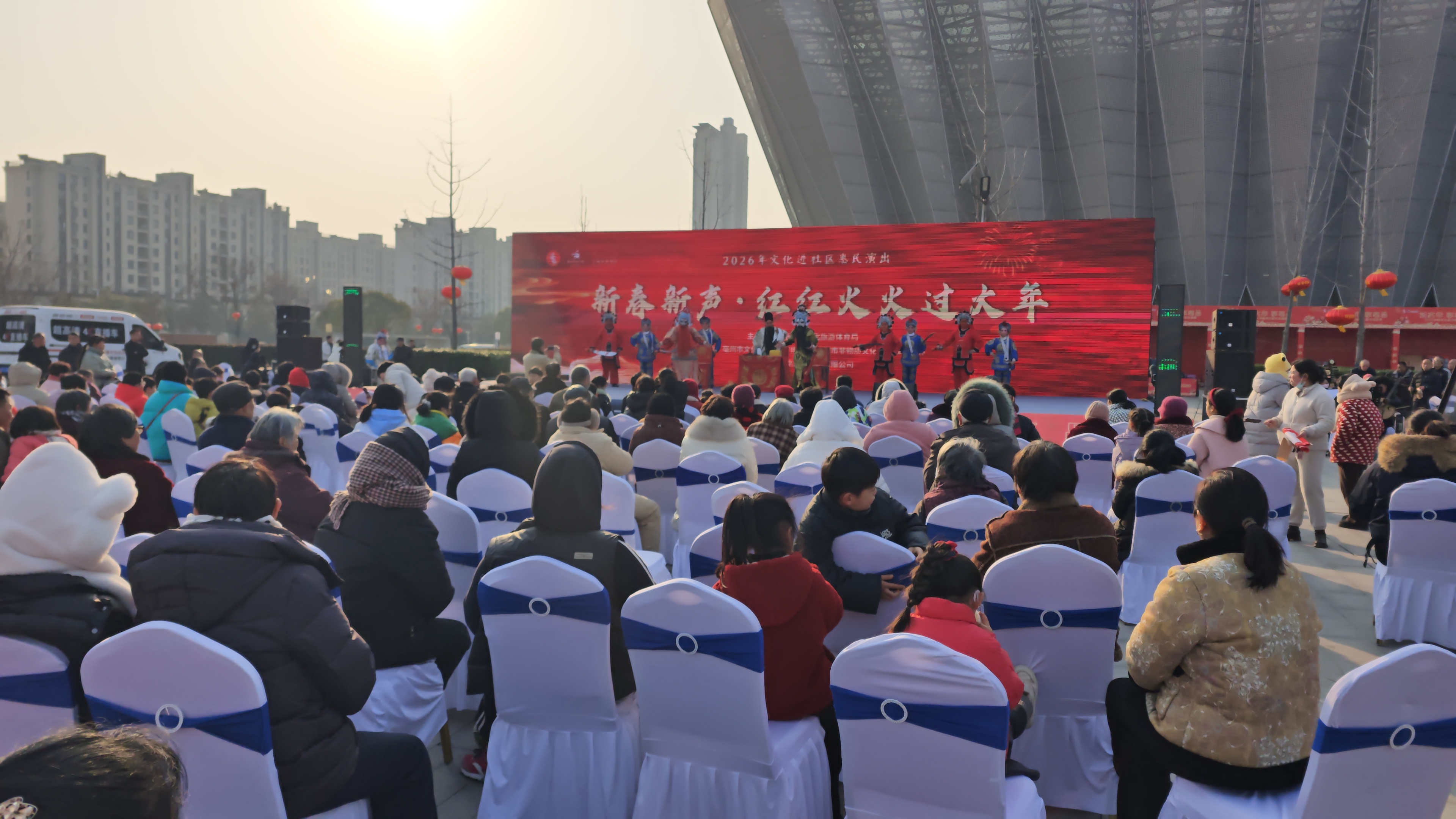 为丰富群众节日文化生活,营造喜庆祥和的新年氛围,助力“过大年·享亳品”2026年亳州文旅市集展销活动,2月7日,由亳州市文化旅游体育局主办,市文化馆、市博物馆、市非遗保护中心承办的2026年文化进社区惠民演出走进亳州市体育馆东门广场,为市民带来一场精彩纷呈的新春文化大礼。