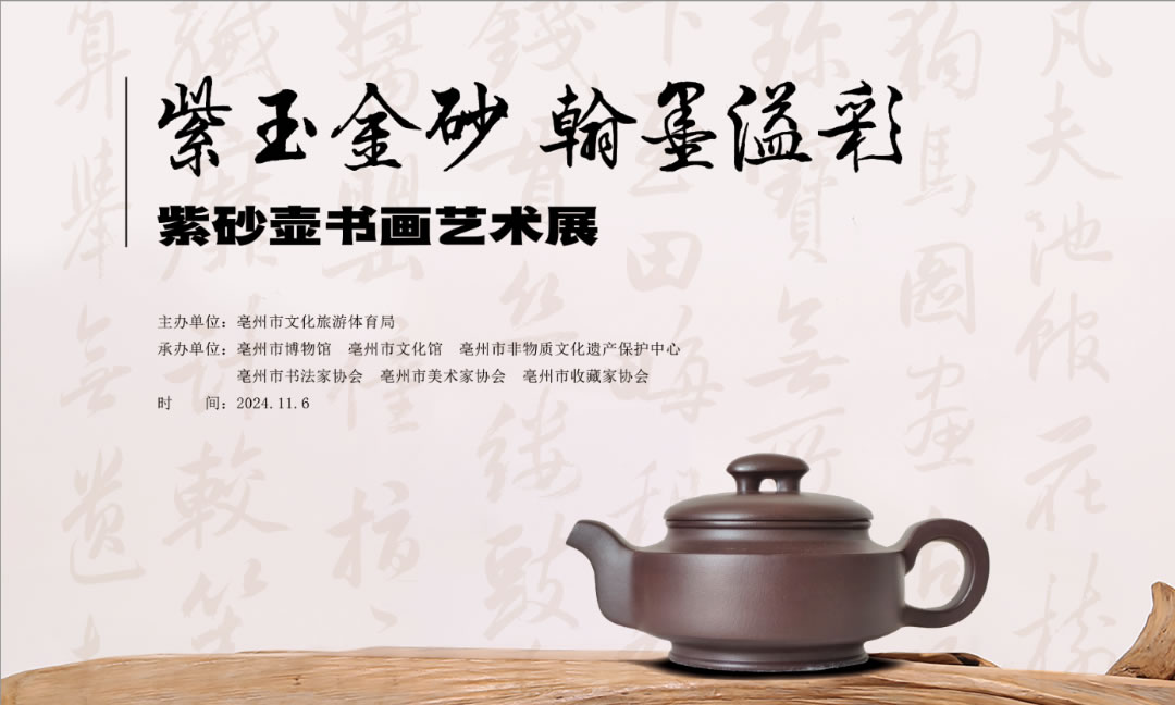 《紫玉金砂 翰墨溢彩——紫砂壶书画艺术展》由亳州市文化旅游体育局主办,亳州市博物馆,亳州市文化馆,亳州市非物质文化遗产保护中心,亳州市书法家协会,亳州市美术家协会,亳州市收藏家协会承办。此次展览,我们汇聚了亳州众多精美的紫砂壶与优秀的书画作品。在这里,可以感受到紫砂壶的精湛工艺与书画的笔墨神韵,领略到传统文化的博大精深与现代艺术的创新活力。让我们一同走进这个艺术的世界,品味紫玉金砂,翰墨溢彩,感受艺术之美带来的心灵震撼。展期为11月6日-11月16日,地点:亳州市博物馆二楼展厅。