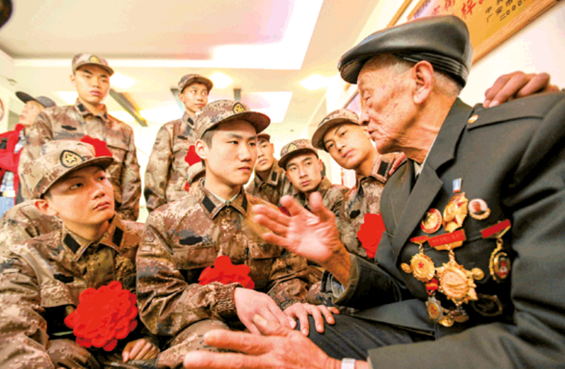 柴云振给来家中探望、即将启程奔赴军营的新兵们讲述战斗故事(资料照片)。新华社发