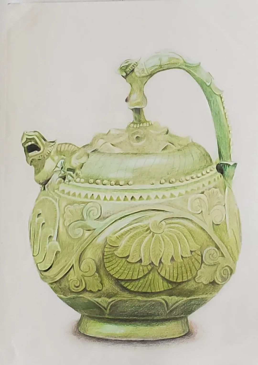 我在博物馆画文物《 五代耀州窑青瓷提梁倒灌壶 》武嘉怡