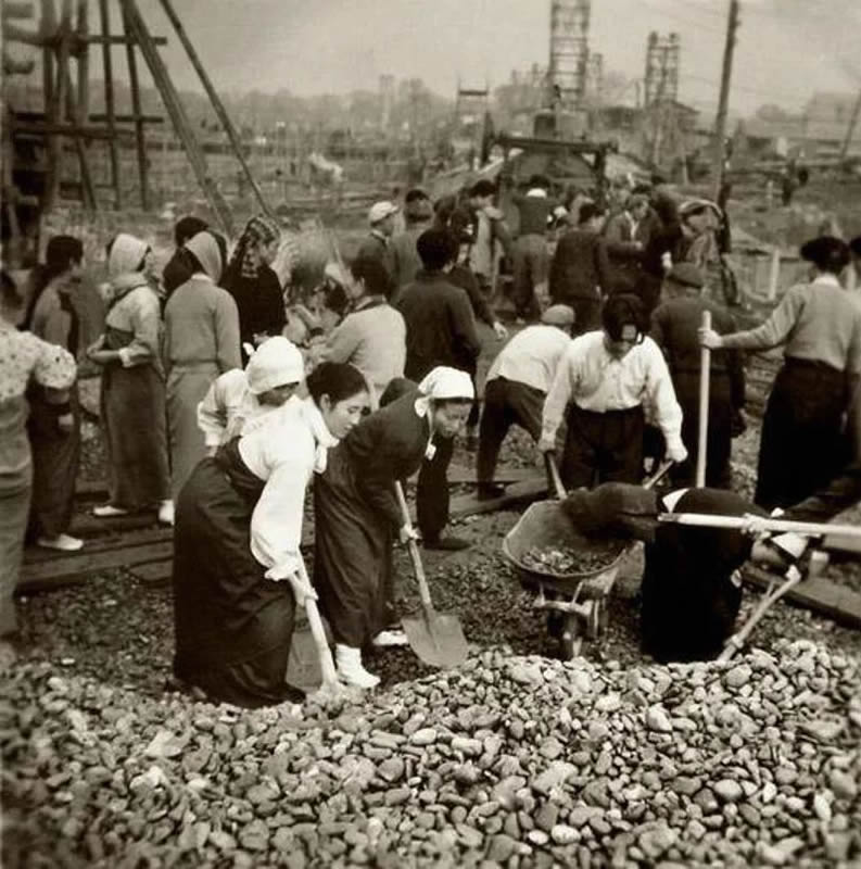 纪录片《北京新建筑》:在这里参加义务劳动的,有我们最可爱的人,有将军,有国家机关干部、学校的师生和市民,有全国各地的先进生产者、劳动模范、红旗手……每一张笑脸都充满了汗水,每一双眼睛都充满了希望——为伟大祖国的首都劳动,这是最大的光荣。