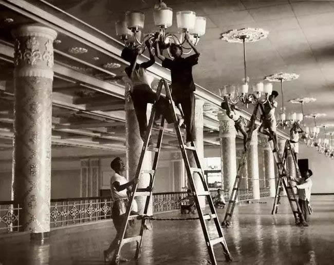 人民大会堂竣工前夕,工人们在宴会厅的骑马廊上安装灯具