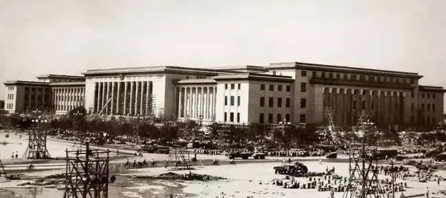 纪录片《共和国脚步》:这座总建筑面积比故宫还大的人民会堂,从设计到建成,一共仅用了一年时间。在此之前的一个多月里,历史博物馆、军事博物馆、民族饭店、民族文化宫、华侨大厦、工人体育场、农业展览馆、北京火车站等建筑也相继落成,为共和国的十周岁生日增添了光辉。