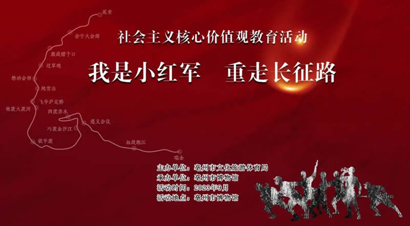9月3日是抗战胜利纪念日,为了推进青少年学生爱国主义教育,增强民族认同感和归属感,勿忘国耻,牢记使命,从小培养爱国情怀和民族自信,由亳州市文化旅游体育局主办,亳州市博物馆承办开展“我是小红军,重走长征路”社会主义核心价值观活动。