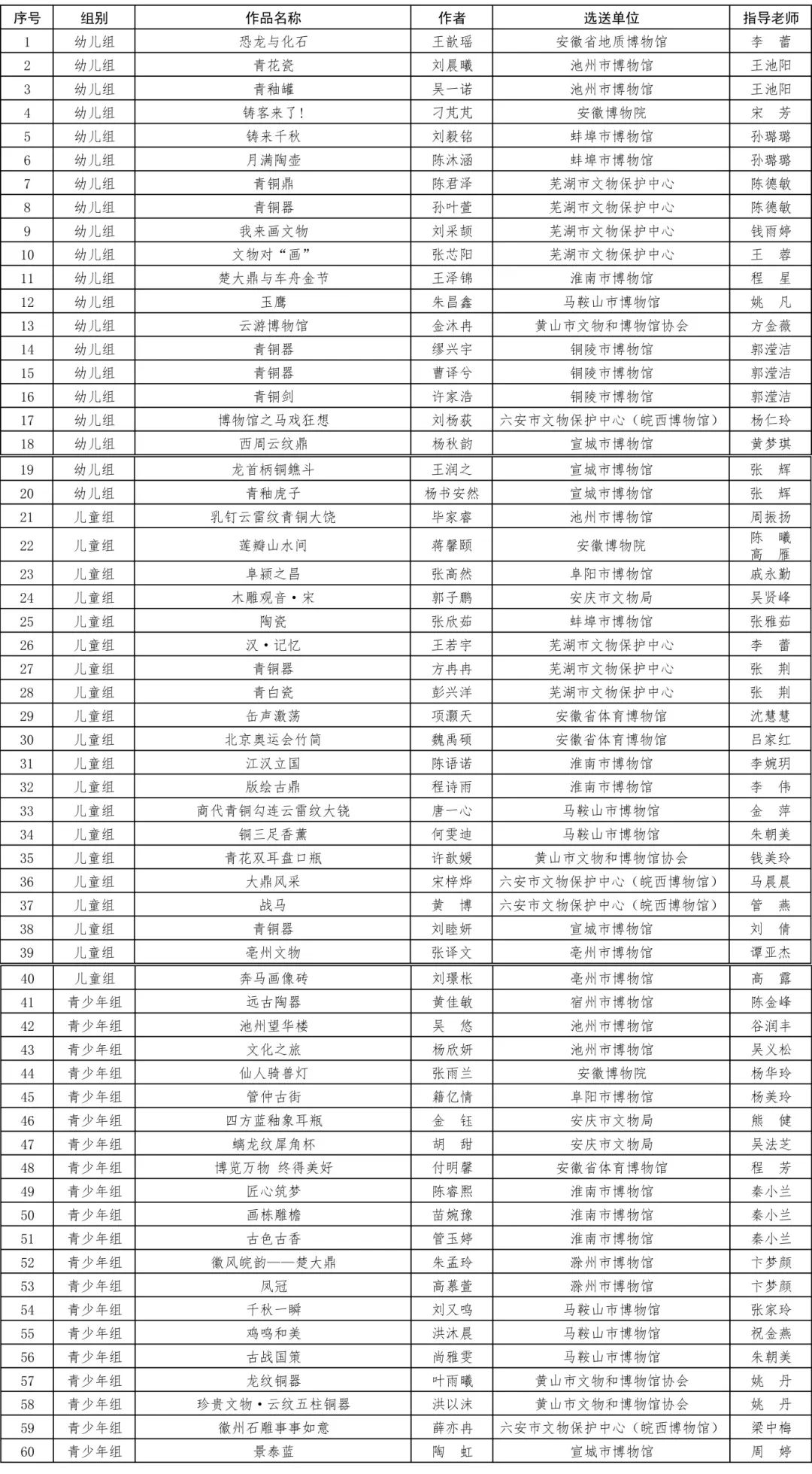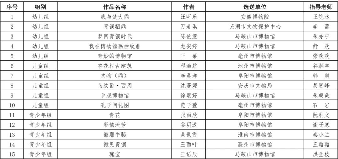 为进一步深入学习贯彻习近平文化思想,积极践行新时代新的文化使命,推动文物活化利用,让文物事业可知可感可见可参与,按照《安徽省文物局关于举办“我在博物馆画文物”全省青少年绘画大展2023年启动暨2022年颁奖活动的通知》(皖文物博函〔2023〕327号)要求,经各单位申报、专家评审,评选出2023年“我在博物馆画文物”全省青少年绘画大展一等奖15名、二等奖30名、三等奖60名和参展奖373名,现予以公示。公示期为7天。 公示期间,如有情况需要反映的,请向亳州市文化旅游体育局机关纪委、大展组委会,当面或用信函、电话反映,提倡用真实姓名,并提供联系方式,以利于对所反映情况作调查了解。 亳州市文化旅游体育局机关纪委 联系电话:0558-5555320 “我在博物馆画文物”全省青少年绘画大展组委会 联系电话:0558-5553396