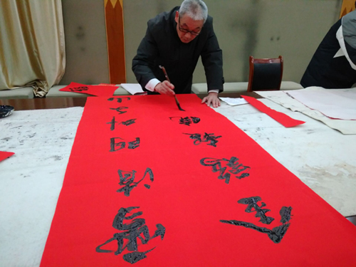 书法家现场泼墨挥毫,为全体职工送上新春祝福。一对对充满诗意,年味洋溢的大红对联摆满案台,现场热烈的书写气氛吸引了许多职工,有的仔细体味着春联的寓意、有的为他们铺纸添墨。在场的职工表示:“这是第一次看到博物馆内现场写春联,并且还是书法家现场泼墨,他们拿着手写的春联,闻着墨汁的淡香,仿佛又回到多年前的时候,非常有过节的味道”。整个博物馆院内处处洋溢着浓浓的节日气氛。