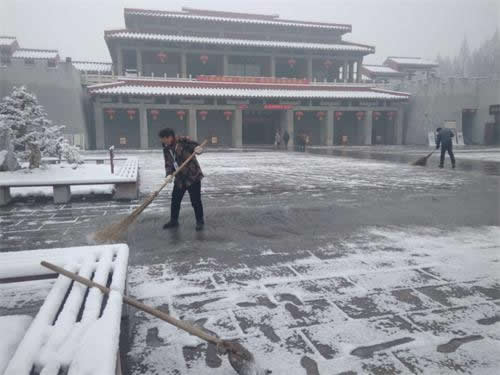 大年初五上午刚上班,在岗值班人员进行打扫清理院内积雪。这次降雪给广大游客带来一些不便,大家拿着扫把、铁锨等工具,将院内、门前雪进行了彻底清理,虽然天气寒冷,但是大家都觉得暖融融的,这次清雪给广大游客带来了便利,同时也给他们提供了一个干净舒适的参观场所。
