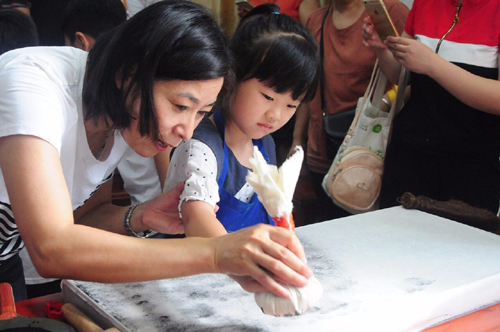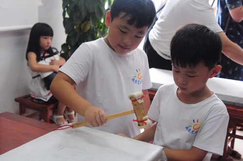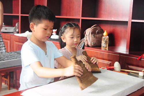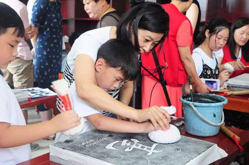 活动现场,在两位专业老师的指导下,孩子们有模有样的刷着宣纸、砸着打刷、敲着小锤、拍着拓包,全神贯注,尽心竭力的完成每一幅拓片。两个小时的现场教学因为不断有游客带领小朋友加入而延长,学习氛围浓厚,活动也吸引到众多游客围观。