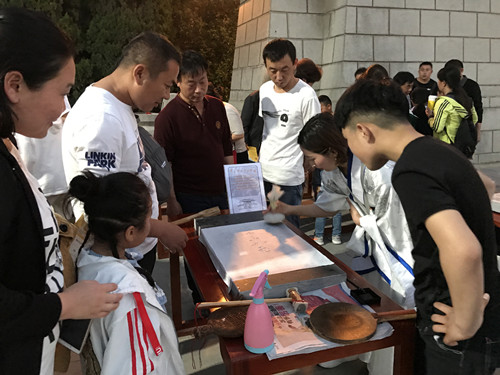 两个小时的拓片制作体验活动吸引了一拨又一拨学生和家长。他们一起制作甲骨文“亳”字、古诗文等石碑拓片。现场学生热情高涨,有的说用拓包一砸,就像在黑板上写一个粉笔字一样神奇;有的说这感觉有点像雕版印刷,但又不像……学生们收获颇丰,不仅把历史、文化、知识与拓片技艺带回了家,还感受到亲子互动的快乐。