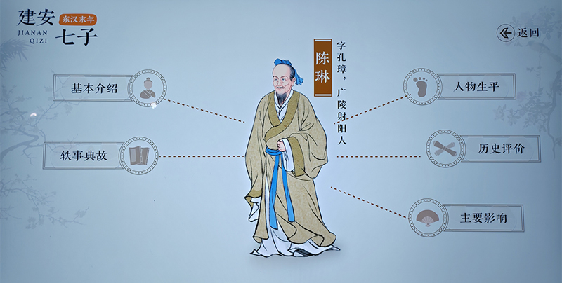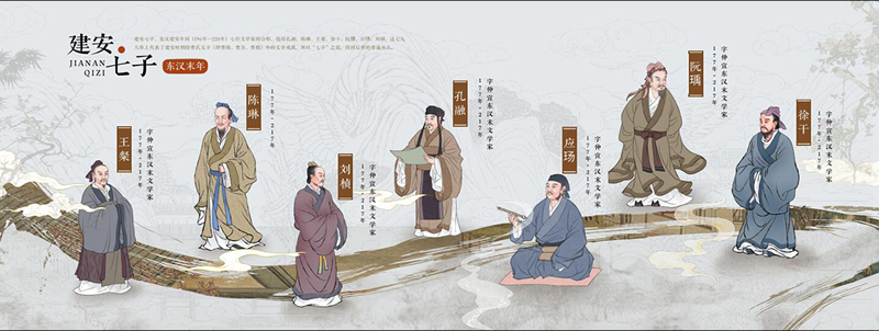 1.陈琳(?-217),字孔璋,广陵射阳(今江苏淮安市楚州区东南)人,为建安七子之一。袁绍军中文书,多出其手。最著名的是《为袁绍檄豫州文》,文中历数曹操的罪状,诋斥及其父祖,极富煽动力,后陈琳为曹军俘获。曹操爱其才而不咎,暑为司空军师祭酒,使与阮瑀同管记室,擅长章奏书记。《饮马长城窟》为他的诗歌代表作,假借秦代筑长城故事,揭露当时繁重的徭役给民间带来的苦难,尤为深刻。