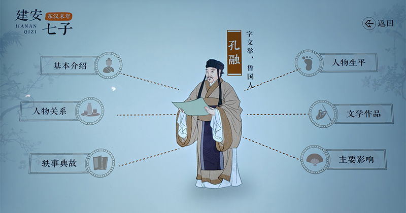 2.孔融(153-208),字文举,其家学渊源,他是孔子的二十世孙,鲁国曲阜人,为曹操所用。《孔融让梨》的故事流传百世。孔融为建安七子之首,文才甚丰。现存作品只有散文和诗。散文如《荐祢衡表》、《与曹公论盛孝章书》辞藻华丽,骈俪气息较多;《与曹操论禁酒书》则有诙谐意味。其《杂诗》第二首,以白描手法写丧子之痛,哀婉动人。