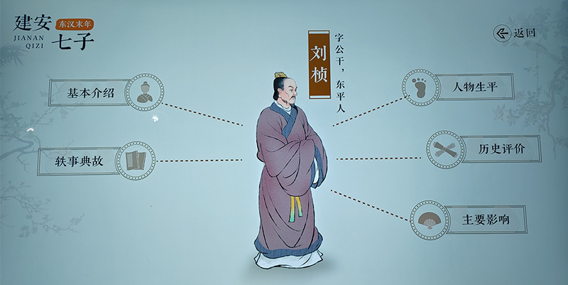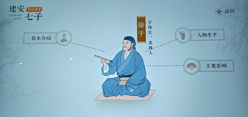 4.徐干(171-217),字伟长,北海(今山东潍坊市)人,建安七子之一。少年勤学,潜心典籍。建安初,曹操召授司空军师祭酒掾属,又转五官将文学。数年后,因病辞职,曹操特加旌命表彰。后又授以上艾长,也因病不就。主要著作是《中论》,曹丕称赞此书“成一家之言,辞义典雅,足传于后。”(《与吴质书》)其情诗《室思》也写得一往情深。