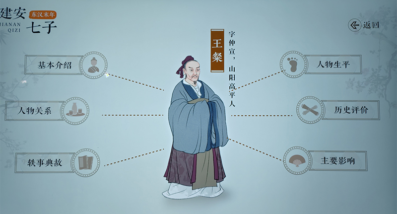 5.王粲 (177-217),字仲宣,山阳高平 (今山东邹城) 人,为建安七子之一。王粲强记默识,善算术行文;曹操赐爵关内侯。他的《七哀诗》和《登楼赋》最能代表建安文学的精神。《登楼赋》是荆州时登麦城城头所作,主要抒发思乡之情和怀才不遇的愁恨,富于感人力量,是抒情小赋的名篇。