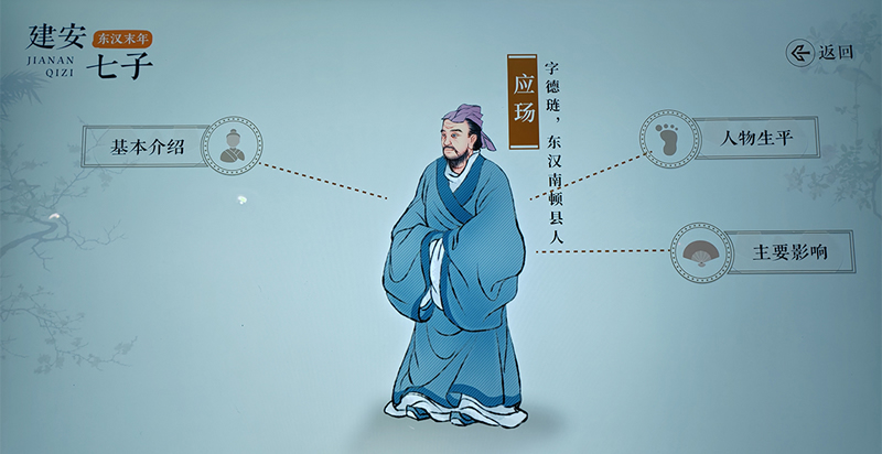 7.应玚 (?-217) ,字德琏,东汉南顿县(今河南省项城市南顿镇)人,建安七子之一。擅长作赋,代表性诗作《侍五官中郎将建章台集诗》。初被魏王曹操任命为丞相掾属,后转为平原侯庶子。曹丕任五官中郎将时,玚为将军府文学(掌校典籍、侍奉文章),著文赋数十篇。诗歌亦见长。