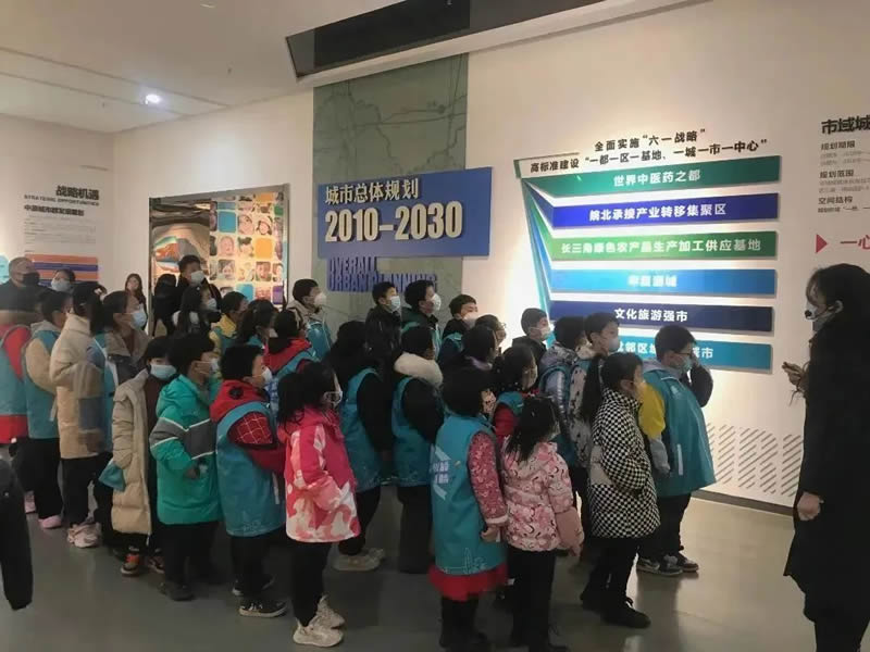 在亳州市展览馆中,小小讲解员们在工作人员的引领下,参观了城市规划、文化旅游、药业、酒业等多个展厅。